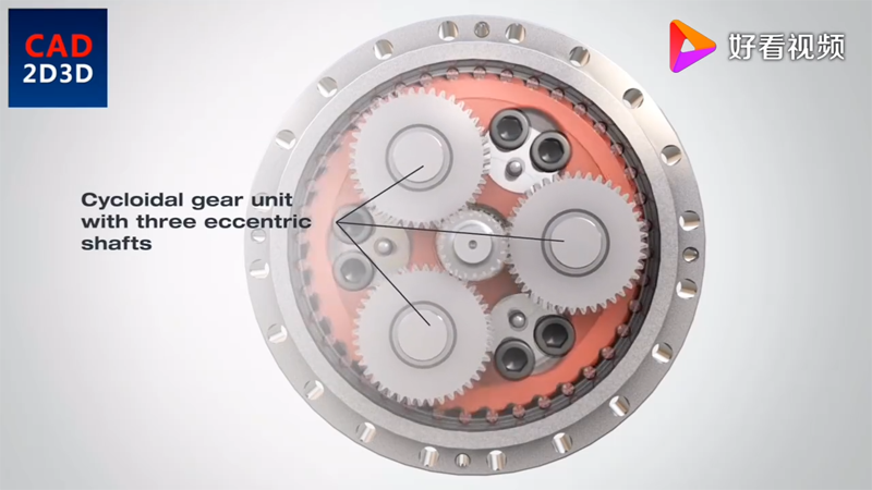 3個(gè)行星齒輪,同輸入齒輪驅(qū)動(dòng),行星齒輪帶動(dòng)曲柄軸旋轉(zhuǎn),曲柄帶動(dòng)RV齒輪朝相反方向旋轉(zhuǎn)。